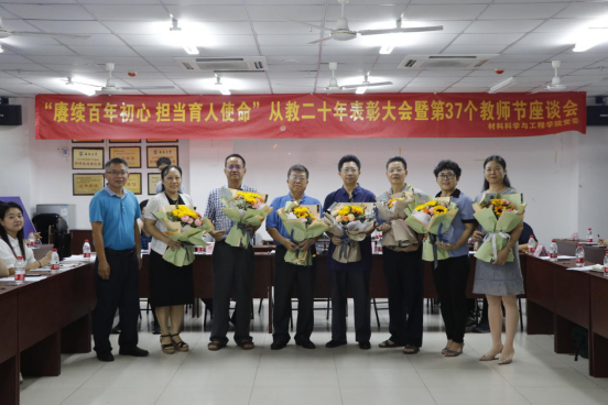 2021年9月10日下午,材料科学与工程学院在研发中心710会议室召开“从教二十年”表彰大会暨第37个教师节座谈会。学院院长廖建和、党委书记胡先文、副院长李长久、林仕伟、涂进春、党委副书记周郭军、教师代表及学生代表参加座谈会。会议由学院党委书记胡先文主持。