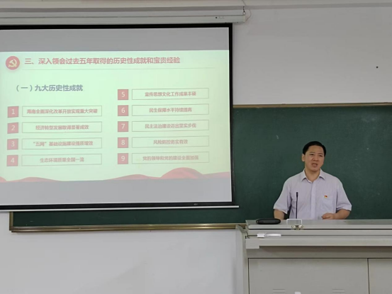 为进一步深入学习贯彻习近平总书记考察海南重要讲话和省第八次党代会精神,助推学院发展,提升内涵建设,6月10日下午,材料科学与工程学院党委和林学院党委联合开展 “学习习近平总书记考察海南重要讲话和省第八次党代会精神”的专题辅导报告会。省第八次党代会精神理论宣讲团专家、我校马克思主义学院涂刚鹏教授受邀主讲,材料学院胡先文书记、廖建和院长、林学院樊春书记、许先升副院长,以及两个学院全体党员参加。报告会由周郭军副书记主持,