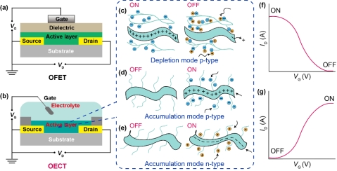 图1.有机电化学晶体管与顶栅-底接触式有机场效应晶体管器件结构对比。