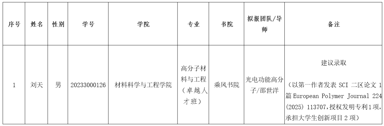 为全面系统深入推进学校“三大改革”,实施“一流本科教育全面提升计划”和“一流学科突破计划”,根据《william威廉英国官网拔尖创新人才培养实施方案》(海大党政办〔2025〕14号)和《william威廉英国官网本科拔尖创新人才培养暂行管理办法》 (海大党政办〔2025〕32号)有关规定。经学生自愿报名,材料学院面试审核,1名学生入围,现将名单予以公示3个工作日。