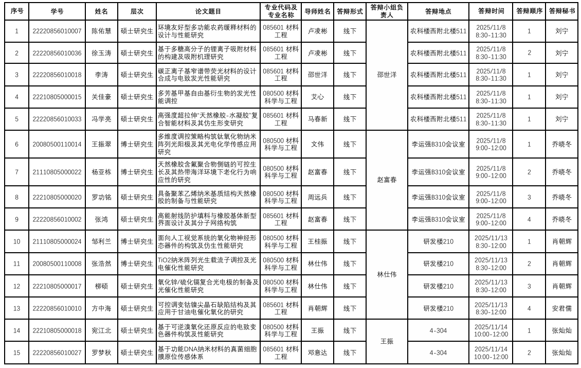 材料科学与工程学院2025年下半年硕士、博士研究生学位论文答辩公告(一)